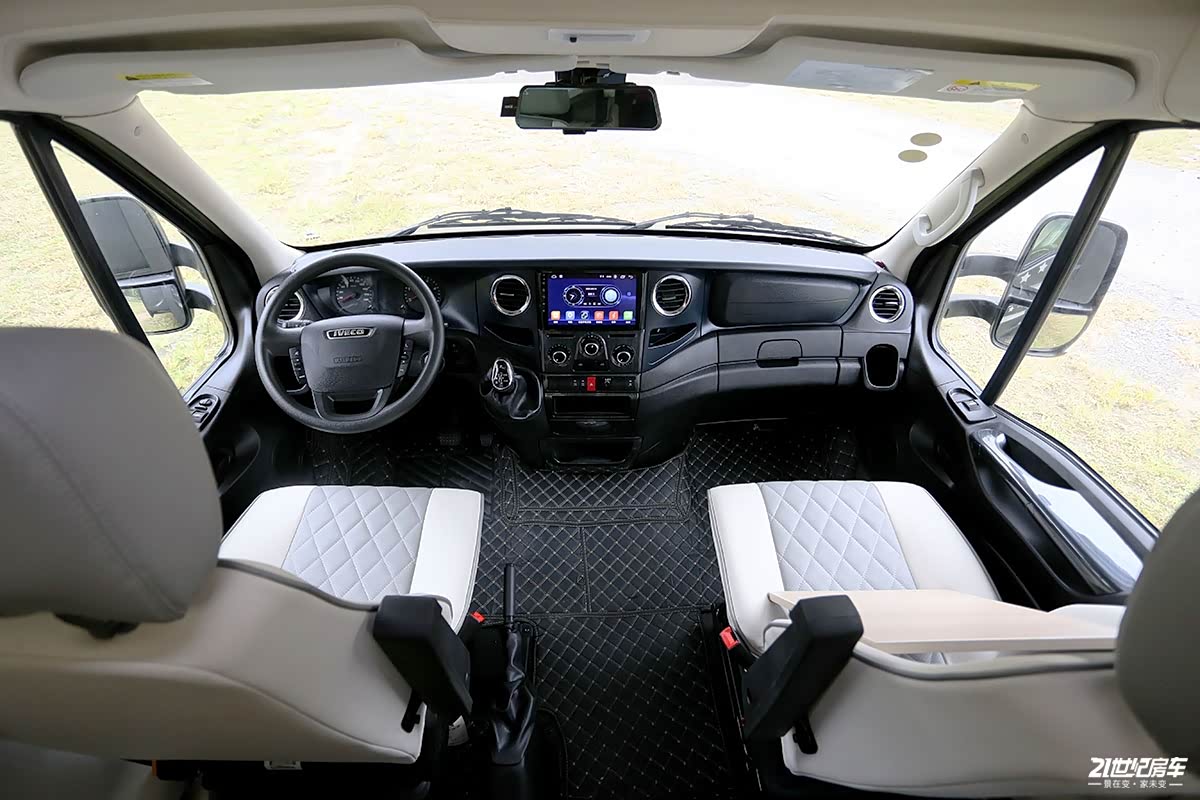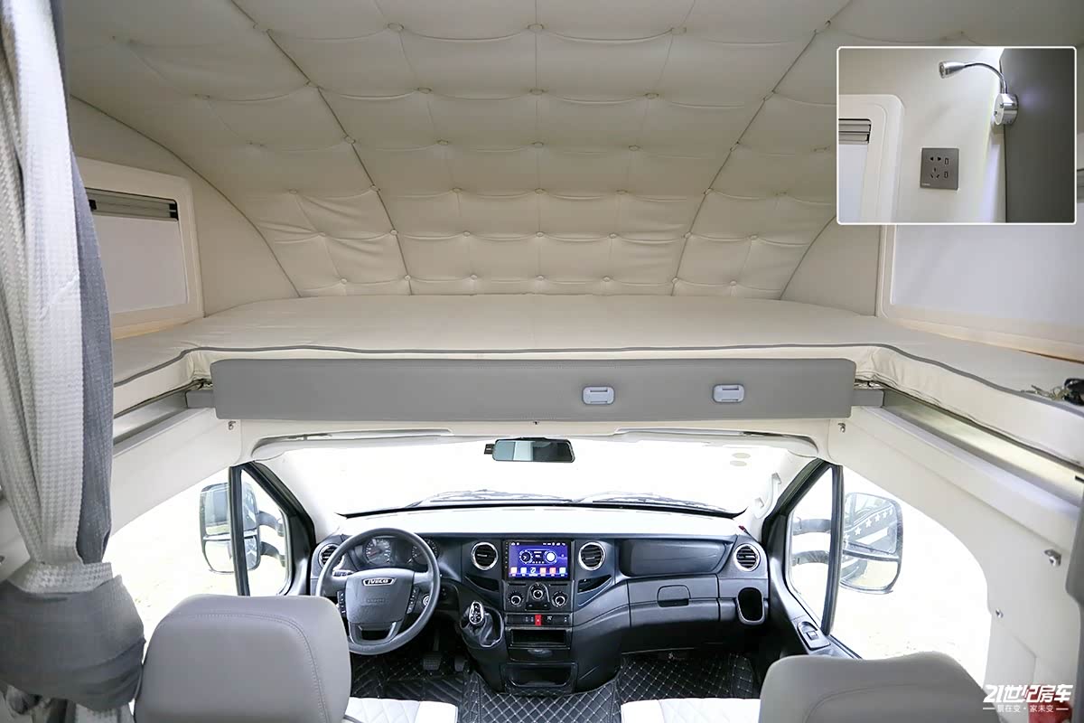 驾驶室上方额头双人床尺寸为2100×1600(mm),采用少见的推拉式设计,对于女生来说也可轻松操作,内顶均为软包处理,有效保护成员安全也具备保温的效果;两侧车窗可保证充足的采光及通风换气效果。