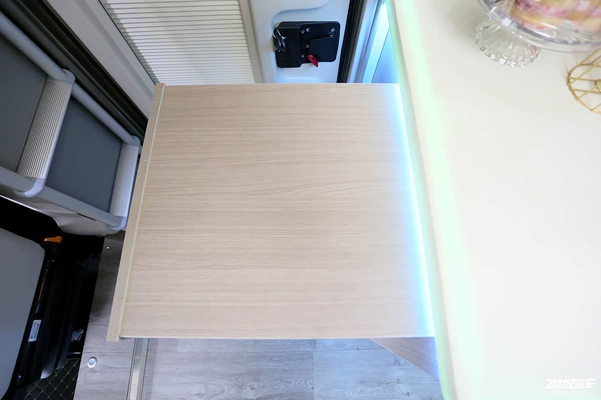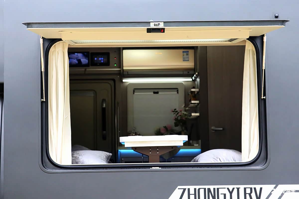 左侧会客区拓展后增加了活动的区域,拓展机构一大亮点体现在墙壁一侧单独设有上掀门(内含窗户),内外均设计有门把手,使采光及通风效果更加明显,而且更加亲近大自然,让用户享受惬意的房车生活。