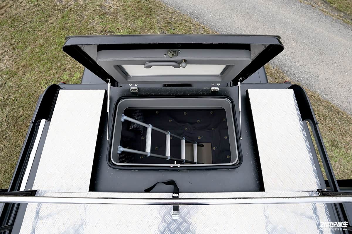 如何登上空中露台,小编带你体验一下,登舱口位于车厢尾部横床上方,通过左右两个液压支杆操作更加轻便,前文说到的伸缩梯此时排上了用场,固定好后可以直接上到车顶露台,周围景色可一览无遗。