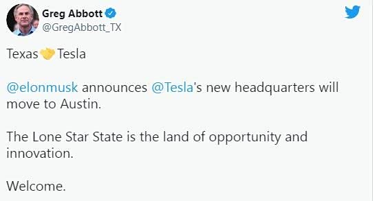 德克萨斯州州长格雷格·阿博特此番也在社交媒体上对马斯克和特斯拉表示欢迎,称“孤星州是机遇和创新之地。”