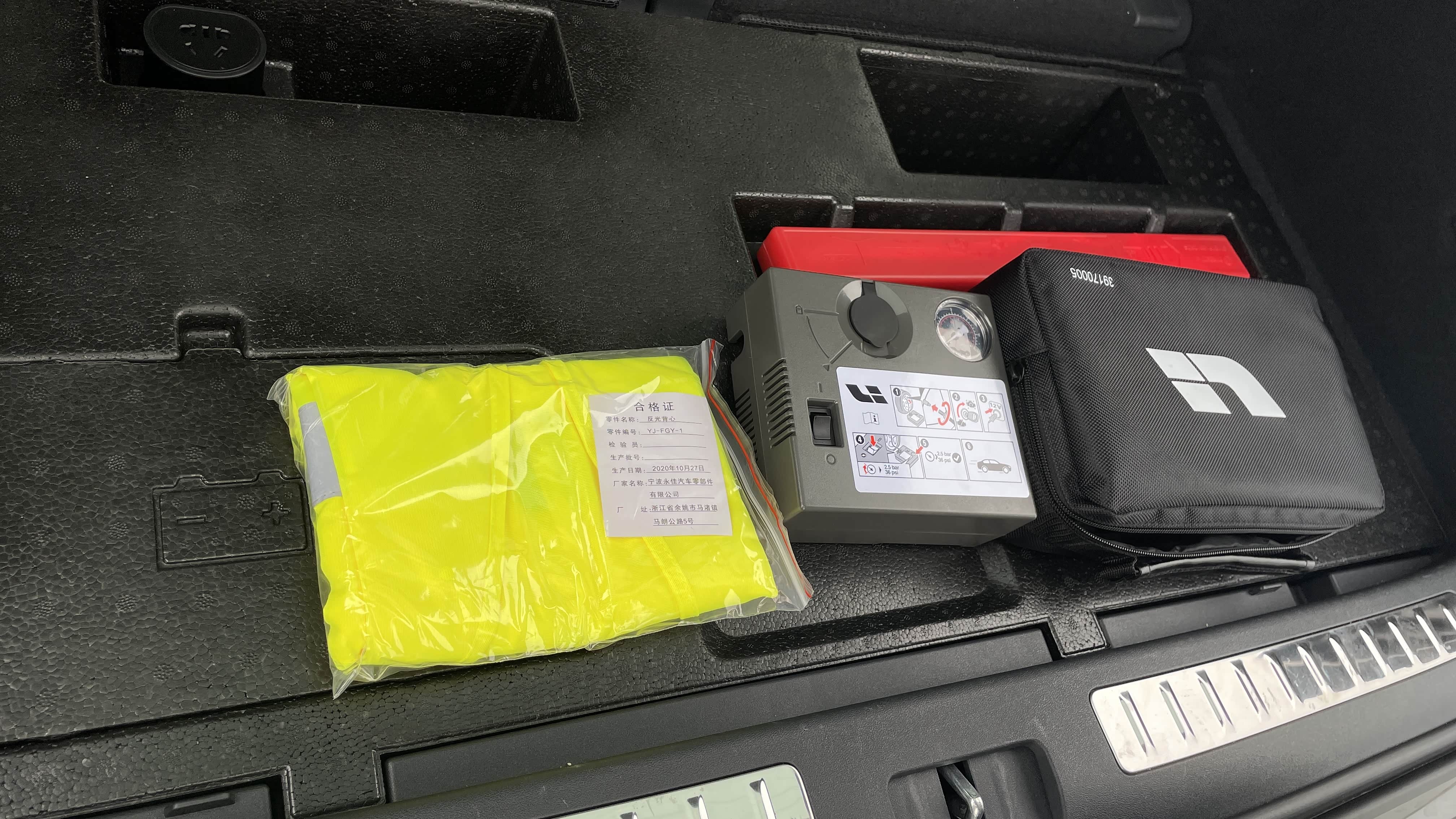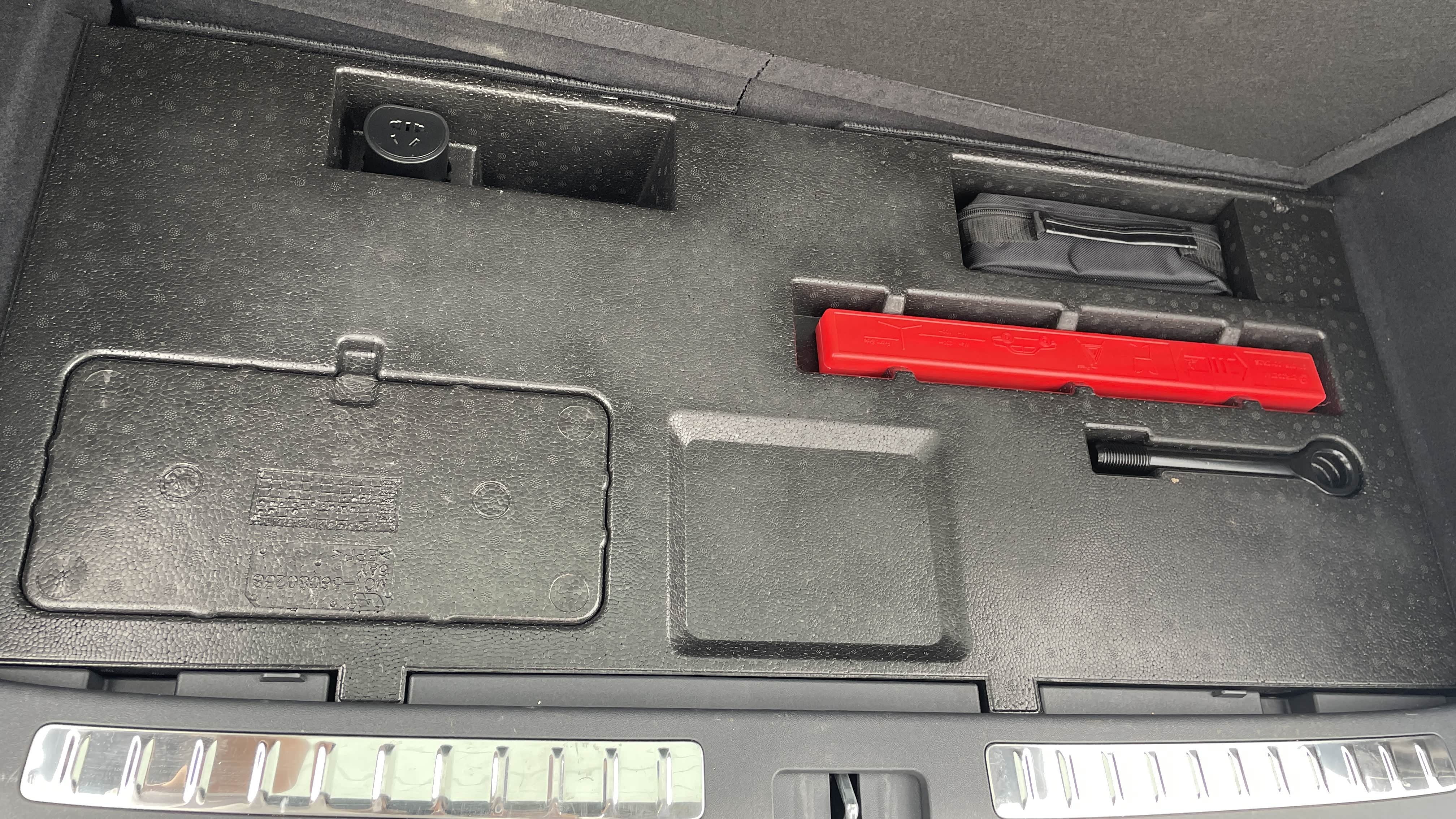 后备箱盖板下配有一个慢充口转五孔国标插座,插座插入慢充口,在车内中控屏内打开放电功能就可以开启这项功能。还配有1个牵引螺栓、三脚架、小储物盒,可以放补胎剂、医疗包等不经常用的物品,以备不时之需。