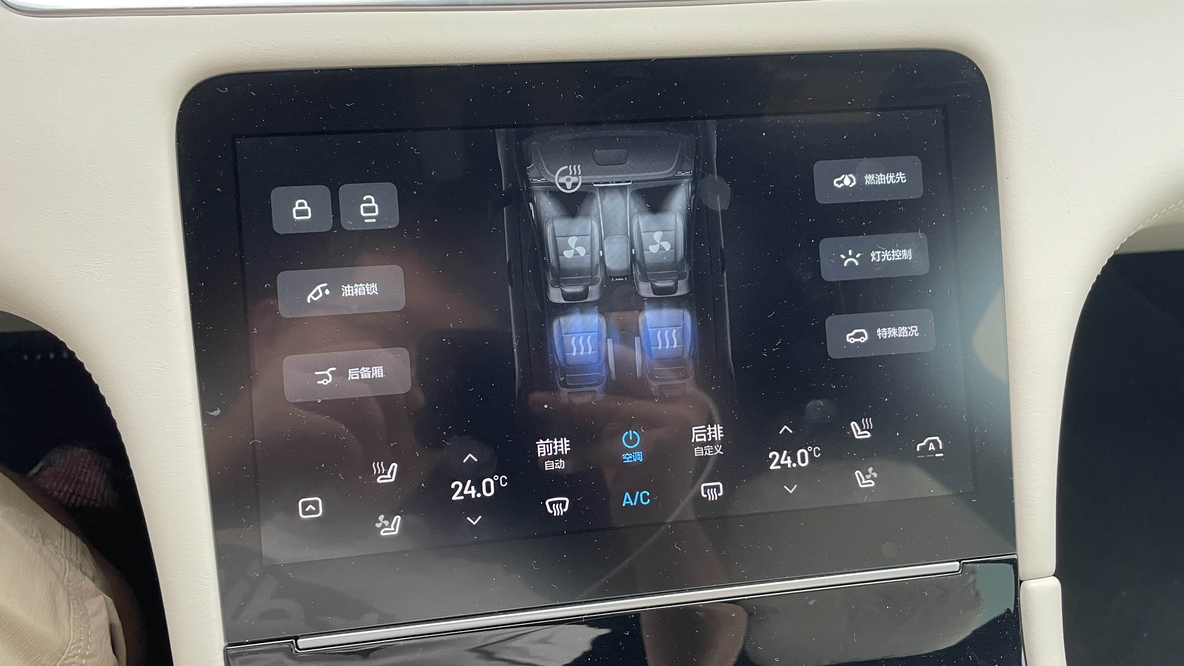 10.1英寸空调触控屏内置座椅加热、按摩、通风调节按键、驾驶模式、灯光调节等功能。