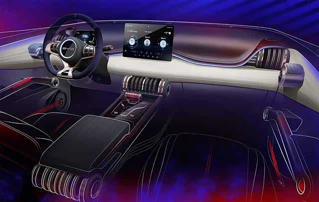 从内饰设计效果图来看,新车的中控台造型有着海豚车型海洋风格的影子,但是在细节上更加丰富,更有设计感。其中中控台中部面板上的线条是类似于古筝的琴弦造型。最为个性的则是空调出风口的设计,使用了健身器材中的哑铃片的形状,另外新车的电子式档杆是飞机式的推进器造型,看上去很前卫个性。