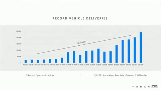 2021年,特斯拉Q3连续5个季度刷新历史最高季度交付,年复合增长率已达到71%,如按第三季度 24.13 万的数量来看,目前特斯拉或许可以实现年交付量达到百万的目标,稳居新能源汽车榜首。