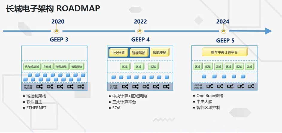 2020年,长城汽车开发出GEEP 3.0电子电气架构,从分布式架构转转成功能域架构,将架构调整为车身控制、动力底盘、智能座舱、智能驾驶4个域控制器,实现软件自主。目前GEEP 3.0已经应用在长城汽车的全系车型上。