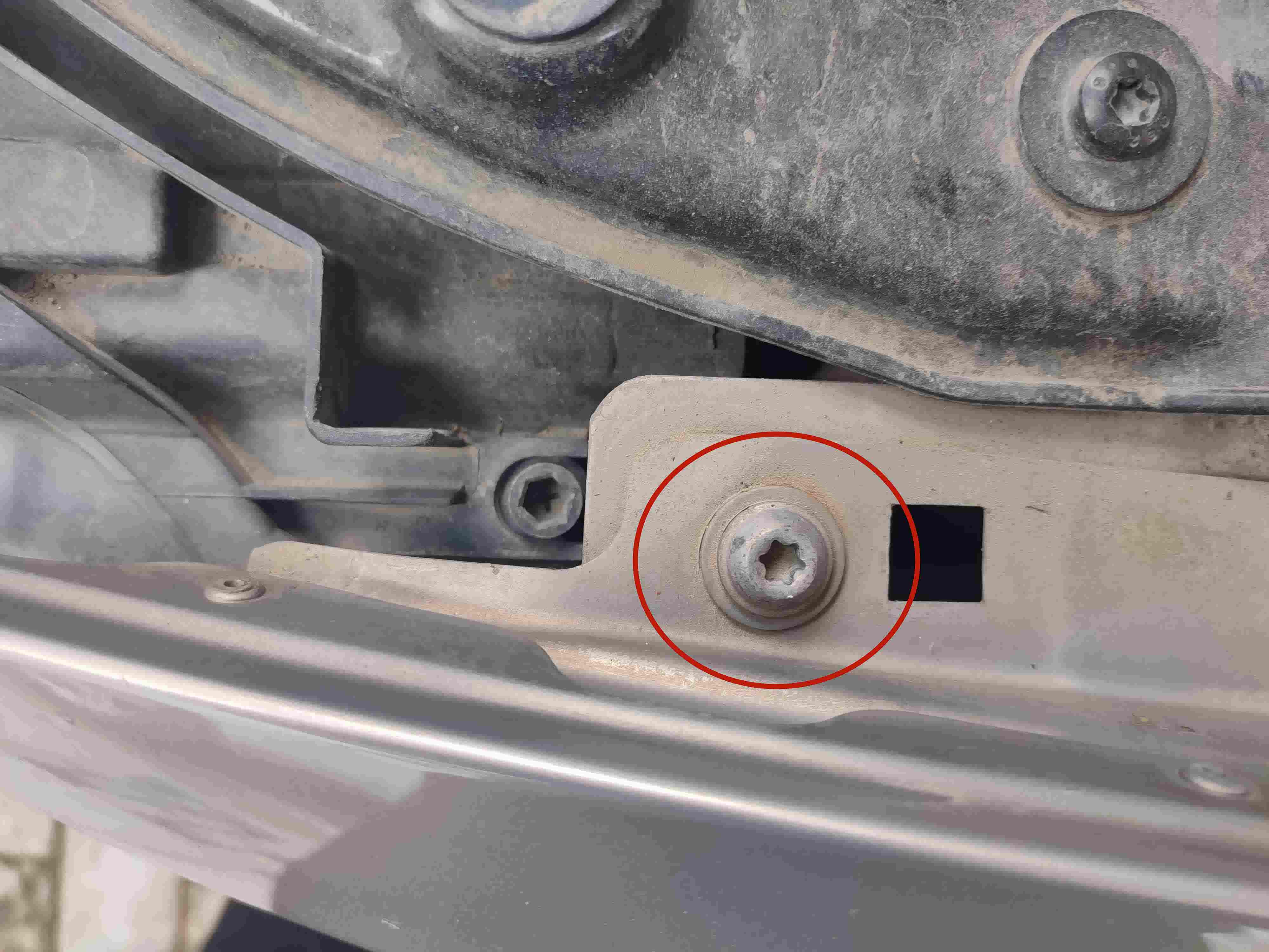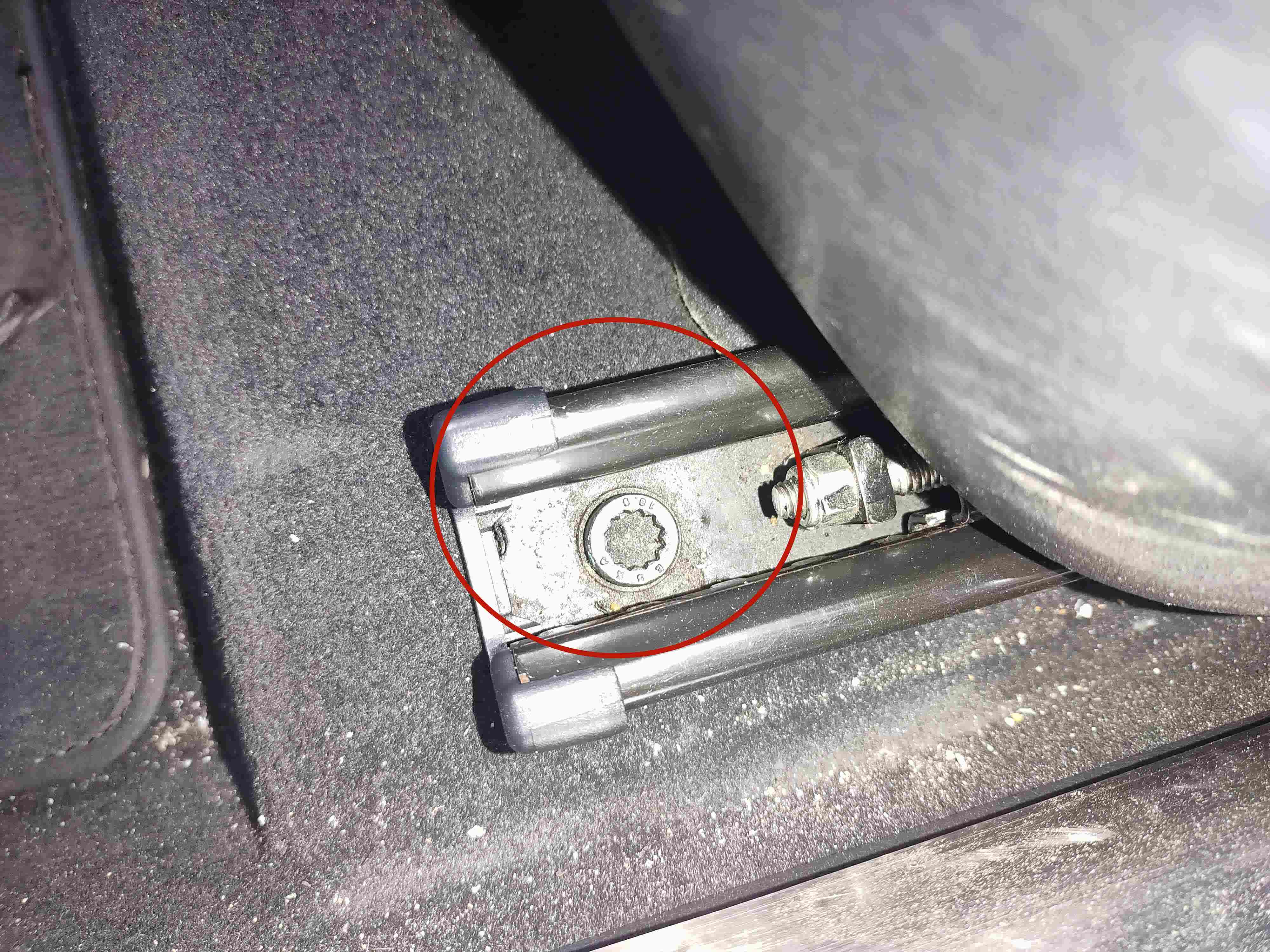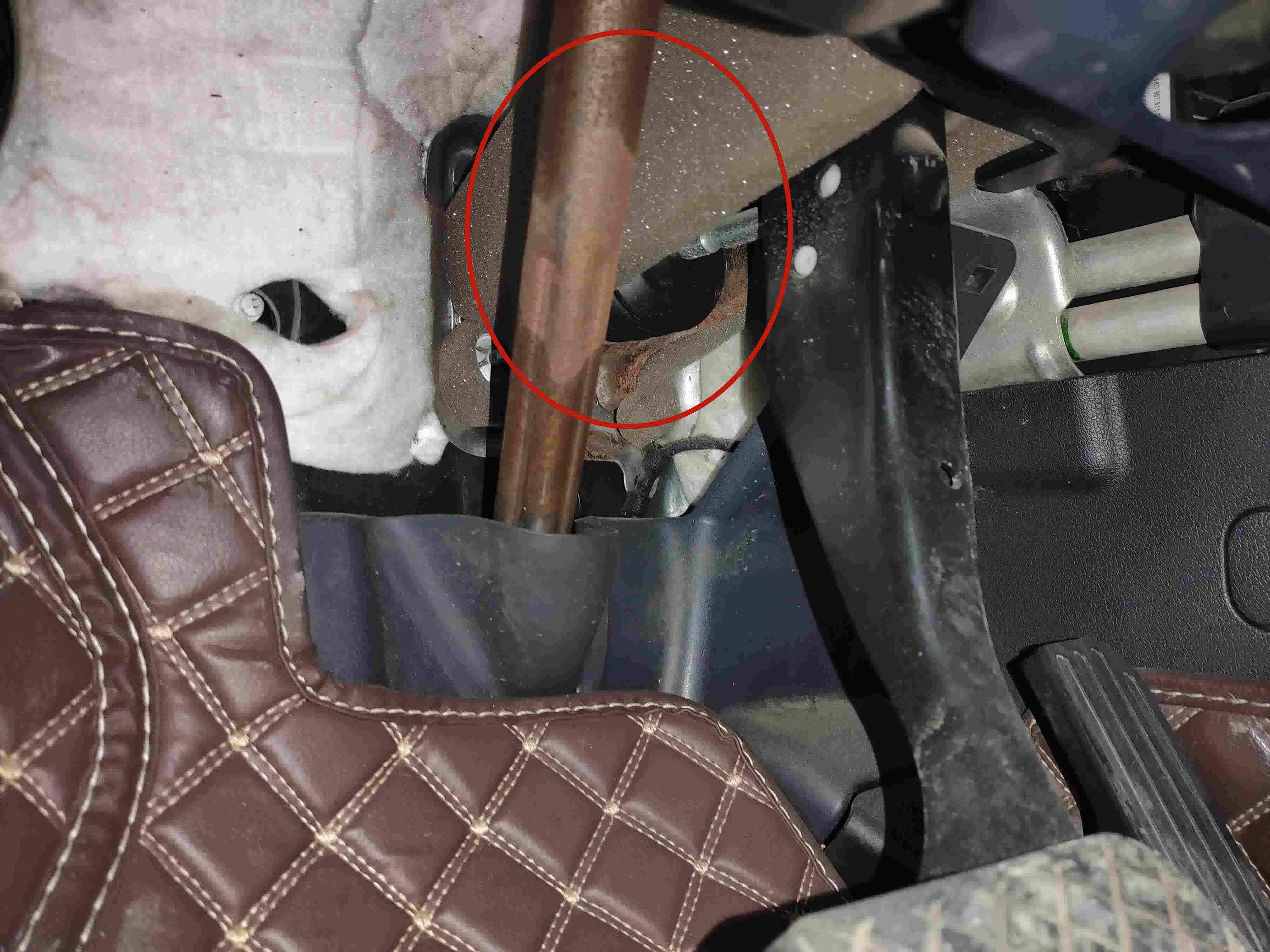 看到了车座,还是挺干净的,每个螺丝都未发现拧动的痕迹,也未发现水泡过之后残留的泥土和锈迹,那刚才转向柱的锈蚀应该是自然生锈,或是平常洗车之后脚垫未晾干的水气导致的生锈,毕竟上边没有漆面保护。