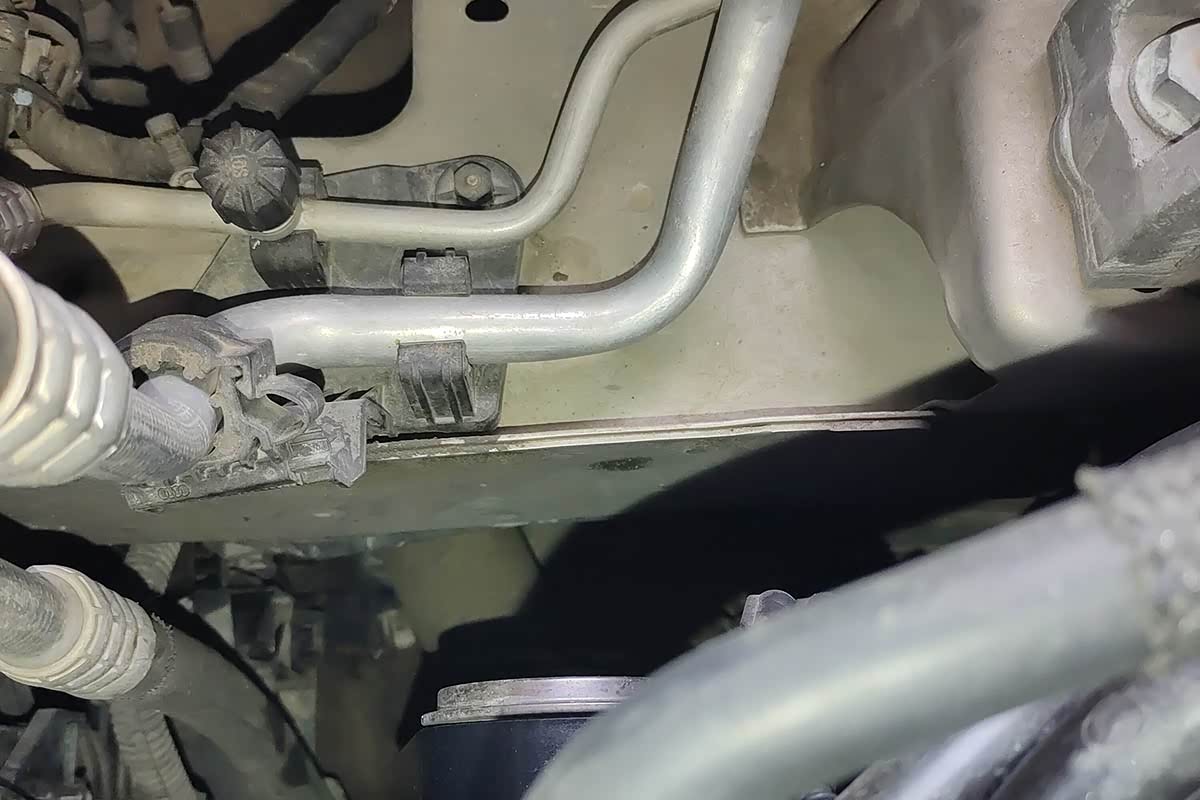 往内部看纵梁目前未发现整形修复的痕迹,防撞梁位置看的不大清楚,这个得等一会底盘检测得时候再做判断。