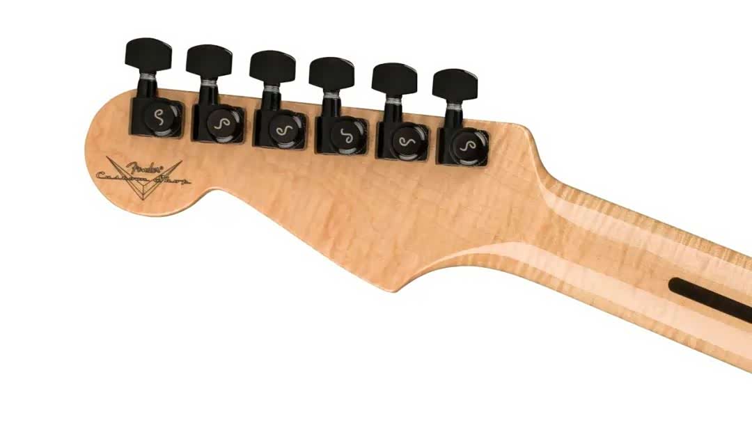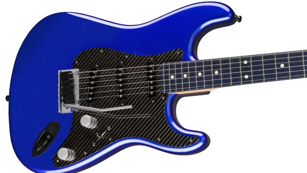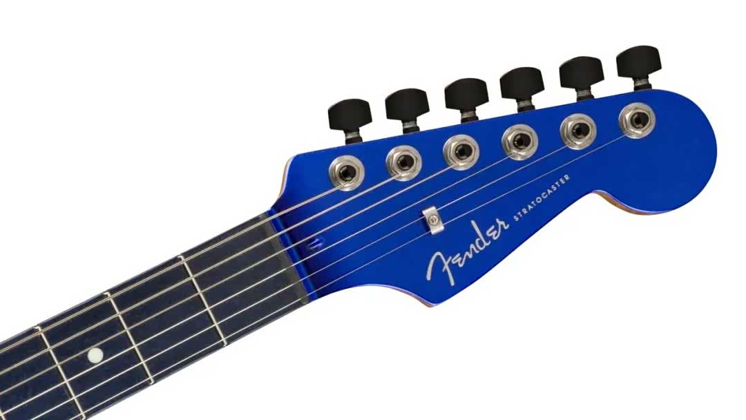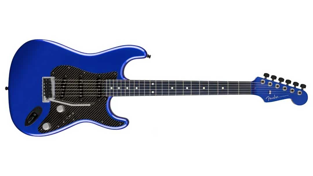 带有镀铬Fender标志的Stratocaster琴身、琴头、指板也是由深蓝色抛光Richlite制成,这是Fender定制产品首次使用。更重要的是,Luminlay指板镶嵌物在黑暗中发出鲜艳的蓝色。