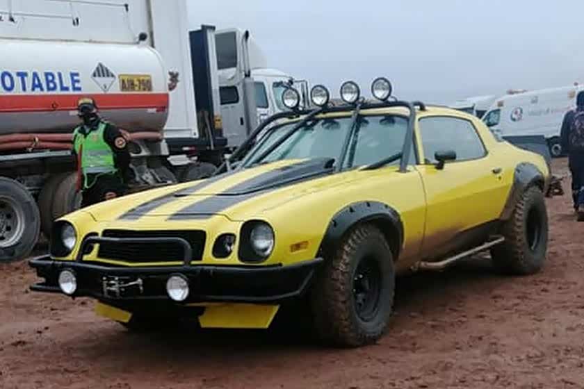 从导演卡普发布的剧照来看,其中一张以秘鲁为背景,可以看到他被几部传奇的经典作品所包围,包括变身为原始卡车形式的擎天柱和大黄蜂(也就是我们所熟知的 雪佛兰科迈罗,不过使用了全新的涂装,并配有全地形轮胎、喇叭形挡泥板、鸭尾式扰流板以及粉碎阻碍物的撞杆);擎天柱的旁边,我们可以看到变身为银色和蓝色涂装保时捷964的幻影,再旁边的则是变身为杜卡迪916的阿尔茜;被擎天柱和大黄蜂挡住了一部分的是变身为大众经典T系列的千斤顶。