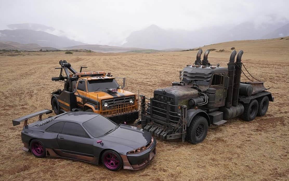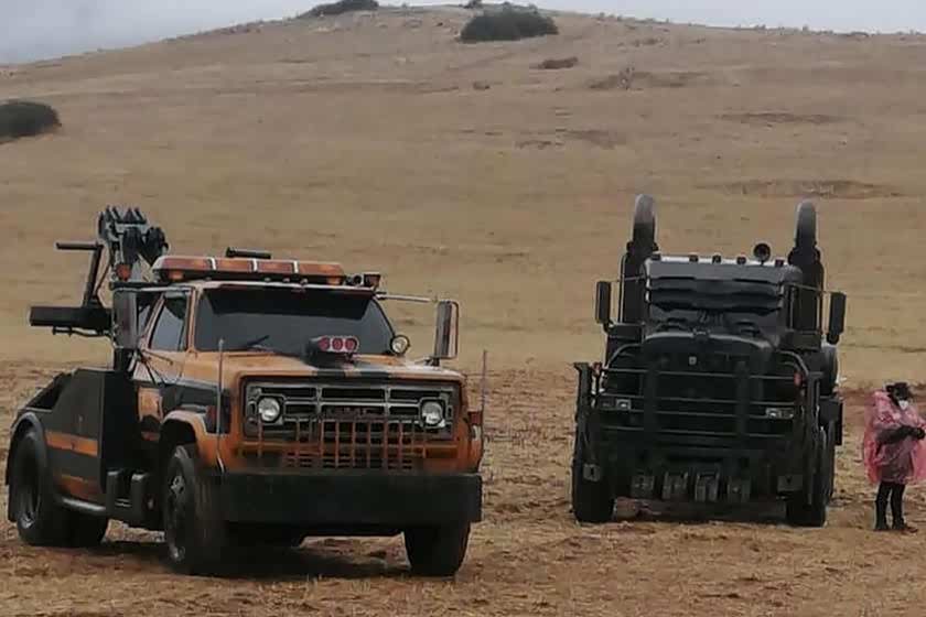 第二张剧照显示了霸天虎侵略性的外观,霸天虎的左侧我们可以看到变身为日产Skyline R33 GT-R的夜莺,并配有铜色和紫色的车身套件;霸天虎的右侧则是变身为黑色Mack卡车的瘟疫。片场还发现了一台橙色GMC Topkick拖车,据称将是一个新的派系龙头部队,将取代霸天虎成为主要反派。