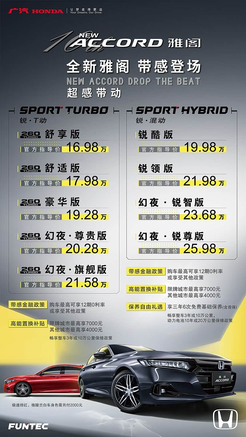 10月9日, 雅阁中期改款正式上市,燃油版包含5个版本,售价16.98万~21.58万,而混动版则包含4个版本,售价19.98万~25.98万。