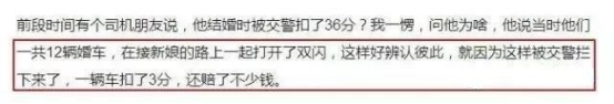 提醒:组车队行驶前,必须向交警部门申报,获得允许后,车队才可以在行驶中使用双闪灯,而没有进行申报批准的车队,在行驶中使用双闪灯的行为是不被法律允许的。此前就有一队婚庆车队,齐齐开着双闪上路迎亲,足足被扣了36分!