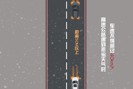 机动车在高速公路上行驶,遇有雾、雨、雪、沙尘、冰雹等低能见度小于100米时,应看情况开启雾灯、近光灯、示廓灯、前后位灯和危险报警闪光灯,车速不得超过40km/h,与同车道前车保持50米以上的距离。