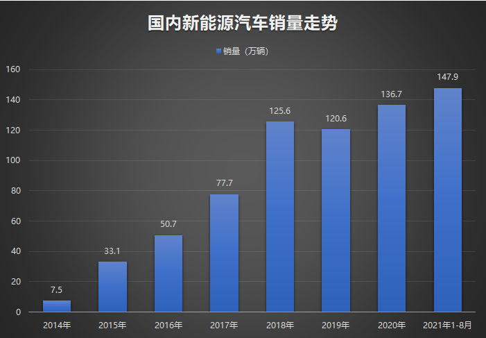 按照乘联会发布的数据,今年1-8月新能源车零售量达到了147.9万辆,同比增长202.1%,其中的8成是纯电动车,全国范围内的电动车保有量也一下子超过了500万辆。