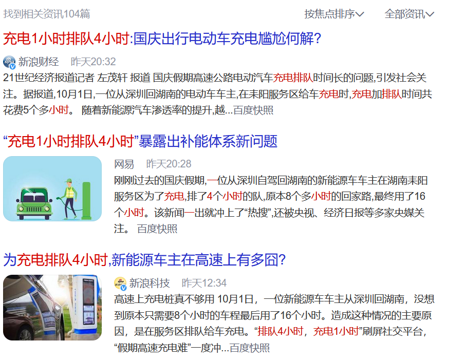 一方面,蔚来、小鹏以及大众ID.系列电动车9月份销量纷纷过万辆,比亚迪新能源汽车月销超过7万辆等都展示了新能源汽车的加速普及,另一方面,国庆期间高速服务区“充电1小时排队4小时”、“为了充电桩大打出手”等相关新闻冲上热搜,再次引发公众对电动车的焦虑情绪。