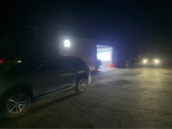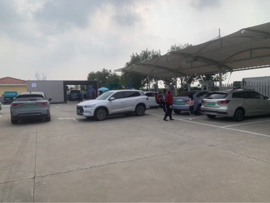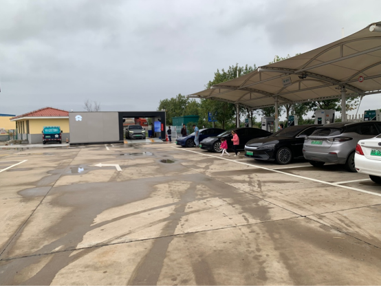 2、滨州休息一晚,第二天开始威海之行,路上第一站选择寿光服务区补能,到了寿光服务区还剩100公里的续航,上趟厕所回来,车已经换好电了,看着旁边充电的车辆,心中窃喜。