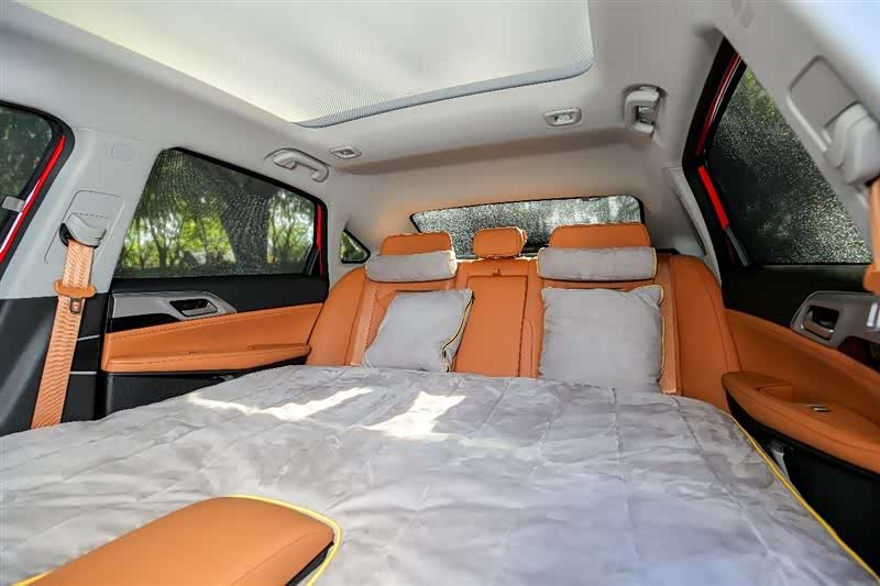 而小鹏也很会利用这部分宽阔的腿部空间。小鹏P5提供给了一个睡眠模式,可以通过语音进行开启。前排座椅会完全放平并与后排座椅相连,同时小鹏也提供了专用的充气床垫、靠枕和遮阳帘等设备,将座舱打造成一个私密空间。这虽然称不上是小鹏P5极具竞争力的一项配置,但绝对是一个十分吸引人的加分项。睡眠模式是作为选装配置进行提供,这也有效避免了无需这一功能的消费者对此付出成本。