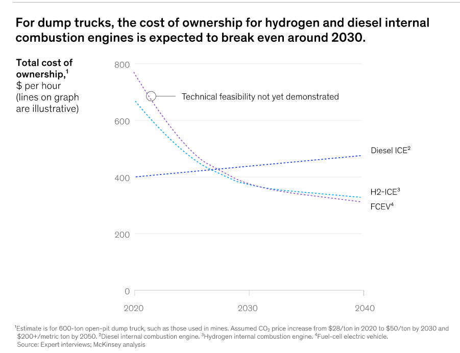 尽管取得了令人瞩目的发展,但电池和燃料电池技术尚未准备好满足许多重型车辆(尤其是非公路用车)所处的恶劣条件所需的极高功率要求。例如,矿用卡车需要数兆瓦的电力,昼夜不停地运行,并暴露在极端振动和热量发展以及空气中的污垢中。几十年来,内燃机一直满足这些要求,从柴油转向氢气可能是使这些发动机脱碳的直接方法,对进一步技术创新的要求相对较小。