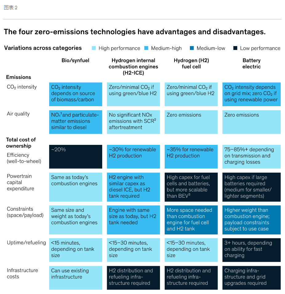 BEV的高效率需要昂贵的电池,而效率较低的氢和生物燃料/合成燃料可以在与今天的柴油发动机基本相同的简单内燃机中燃烧,它们可能比柴油发动机更便宜,因为排气处理要求较低。