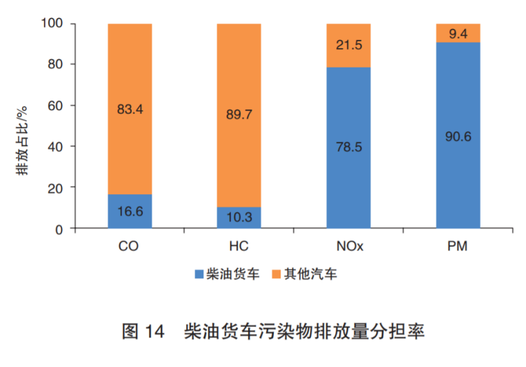 根据生态环境部《中国移动源环境管理年报(2021)》,2020年,全国汽车一氧化碳(CO)、碳氢化合物(HC)、氮氧化物(NOx)、颗粒物(PM)排放量分别为693.8万吨、172.4万吨、613.7万吨、6.4万吨。其中,柴油车排放的氮氧化物(NOx)占汽车排放总量的80%以上,颗粒物(PM)占90%以上;而汽油车排放的一氧化碳(CO)占汽车排放总量的80%以上,碳氢化合物(HC)占70%以上。