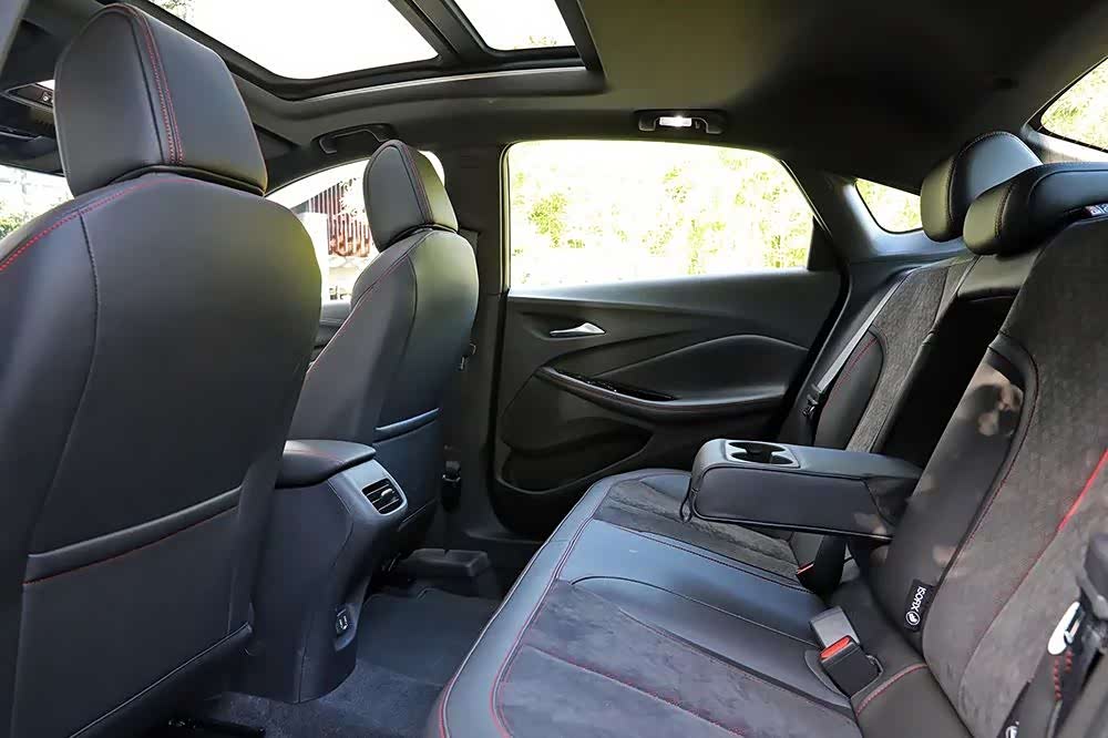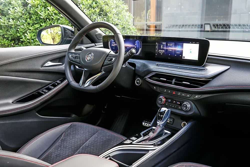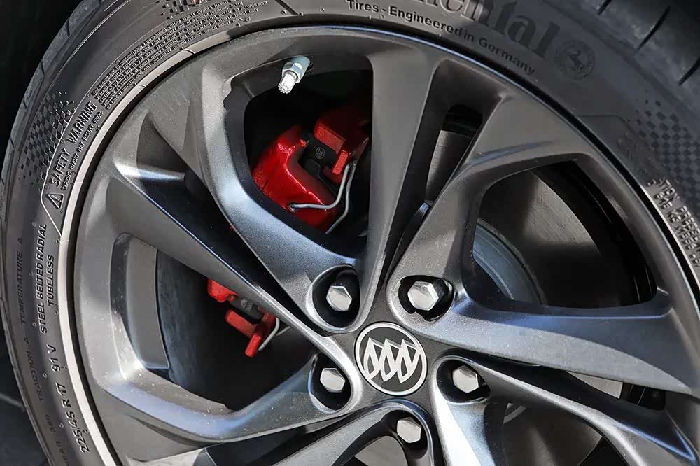 本次试驾的正是全新威朗Pro GS车系的顶配版本——疾风版。一眼看去,相信很多人都会对这款威朗Pro GS的外观打出较高分数,充满张力的前脸采用别克标志性的飞翼式立体格栅,从logo两侧延伸出的飞翼饰条与LED日行灯连成一体,熏黑蜂窝状格栅以及显著的红色GS标识也烘托出了车辆的运动气质。车侧的双腰线设计刻画出蓄势而发的力量感,车尾一体式尾翼与后挡风玻璃形成15°夹角,从而获得优化的空气动力学效果,车身整体风格大气而不失灵动。除此之外,威朗Pro GS还对外后视镜罩、车窗饰条、车顶上采用黑色设计,前后保险杠运动套件则为枪灰色涂装,配上熏黑的双五辐轮毂搭配红色卡钳,犀利动感氛围满满。另外,其前后下包围与护板、侧围、尾翼等车身组件均可自由更换,车主可自由选择组合以打造鲜明的个性化风格。