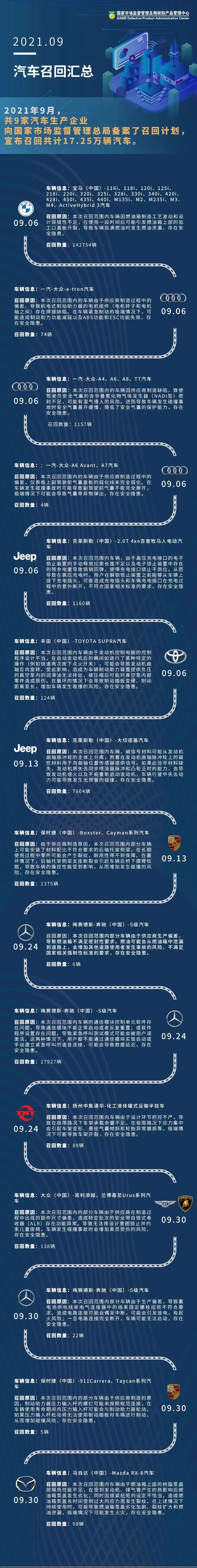 2021年9月,共9家汽车生产企业向国家市场监督管理总局备案了召回计划,宣布召回共计17.25万辆汽车。值得一提的是,九月国内汽车召回有德系豪华品牌宝马、奔驰、保时捷、奥迪齐齐上榜,也有难得一见的日系小众车型,比如丰田SUPRA、马自达RX8。下面我们一起看下召回的具体内容。