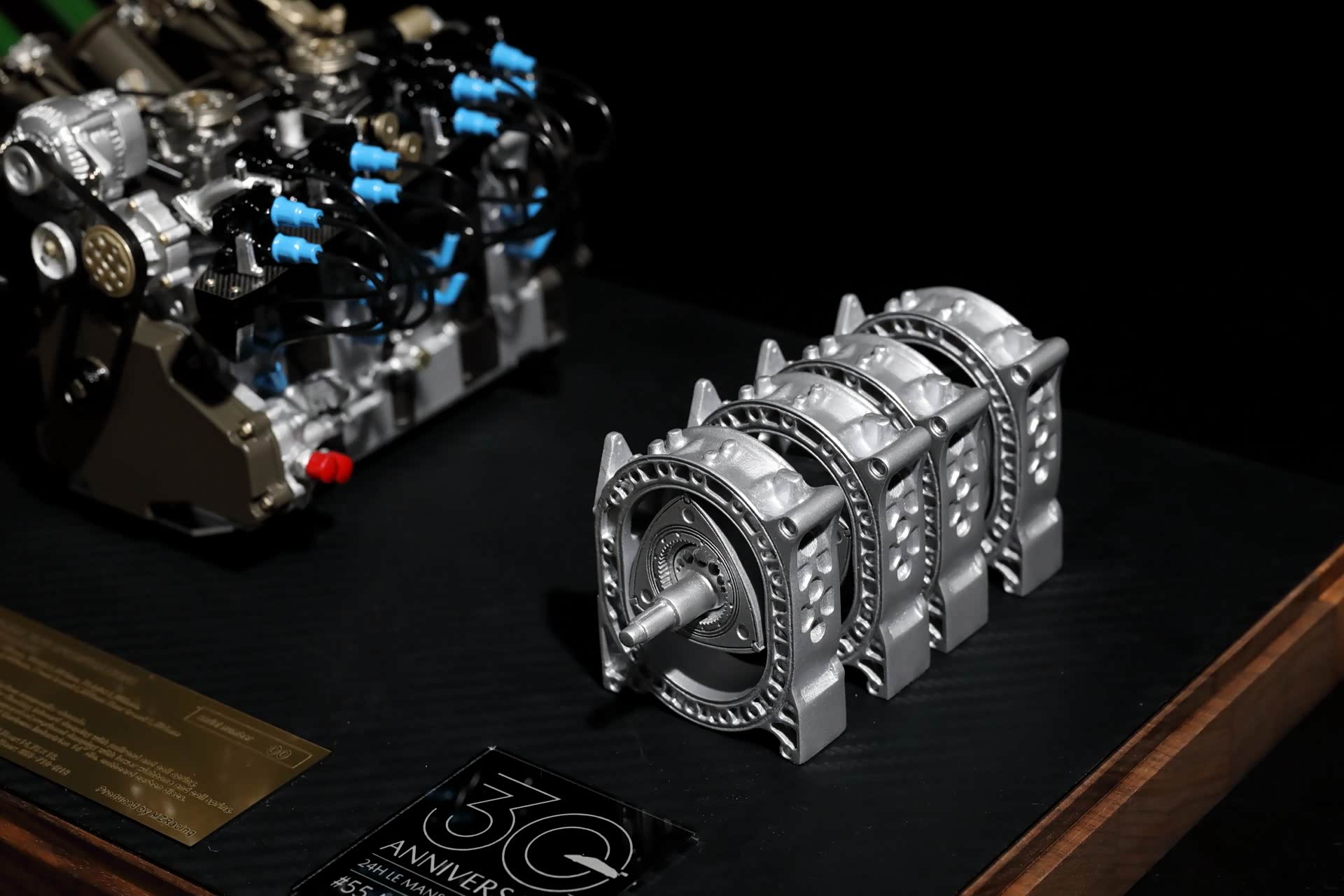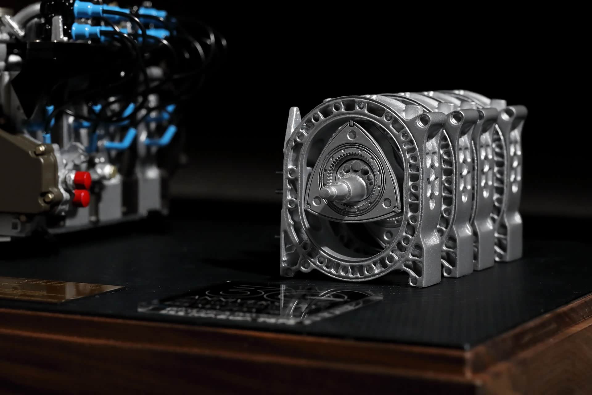 虽然该模型没有任何移动部件,但其细节水平令人惊叹。由偏心轴连接的所有四个转子都被固定在与第一个转子相关的正确位置,转子外壳有比赛规格的进气口,并复制了歧管和燃烧室两侧的微妙差别。