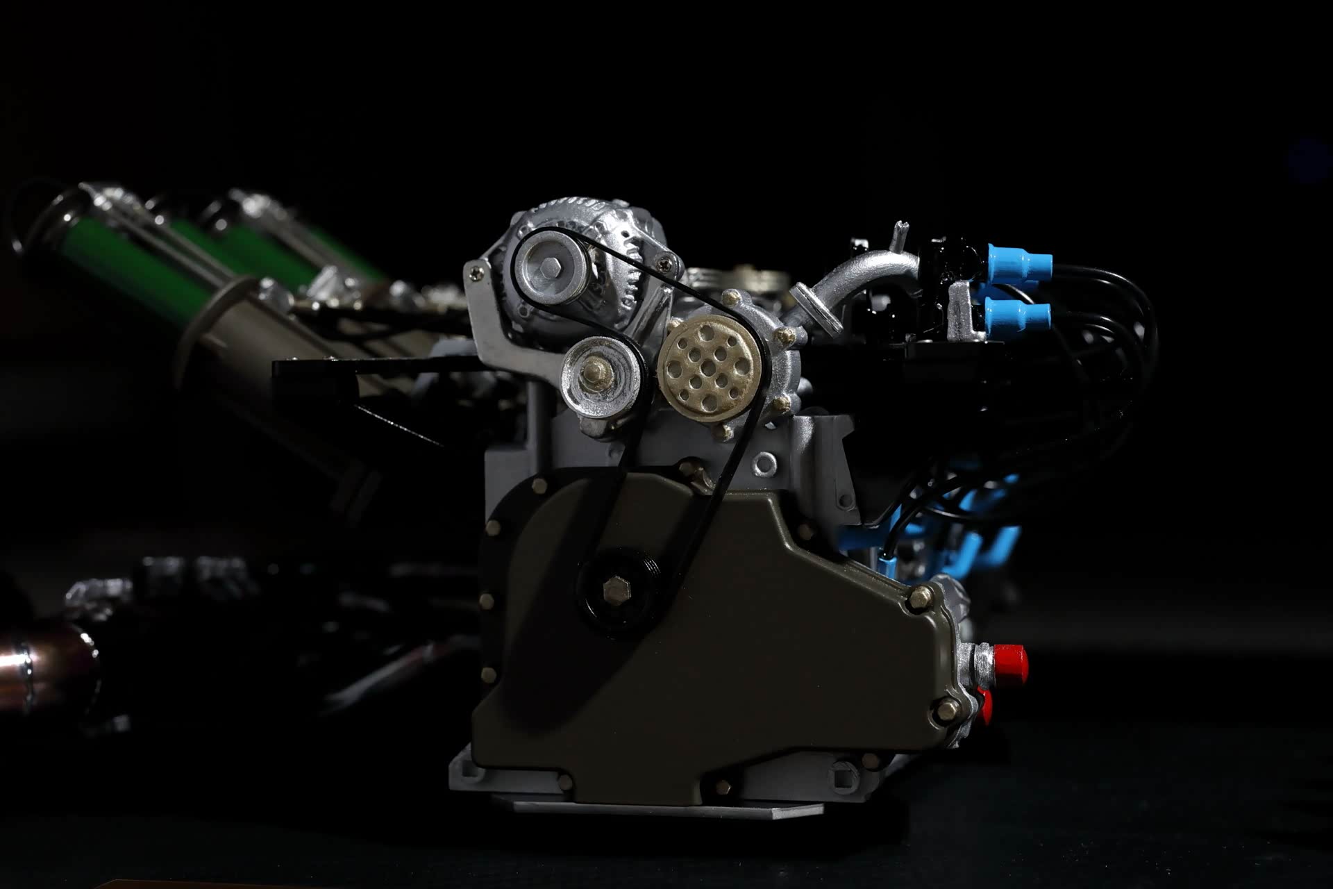 连同碳纤维风格的基座和亚克力外壳,该模型长宽高为400×230×140mm,重约3kg。它由树脂和白色金属制成,火花塞线和皮带使用了橡胶。