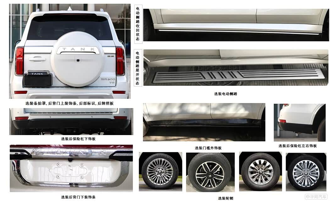 从坦克500的申报信息来看,轮胎有四种规格,分别是265/65 R17,265/60 R18,265/55 R19,265/50 R20,从实用环境来说,17和18寸的车型主打户外越野,也就是可能会出现在坦克500越野版上,而19和20寸的规格则以城市为主,会出现在坦克500城市版车型上。