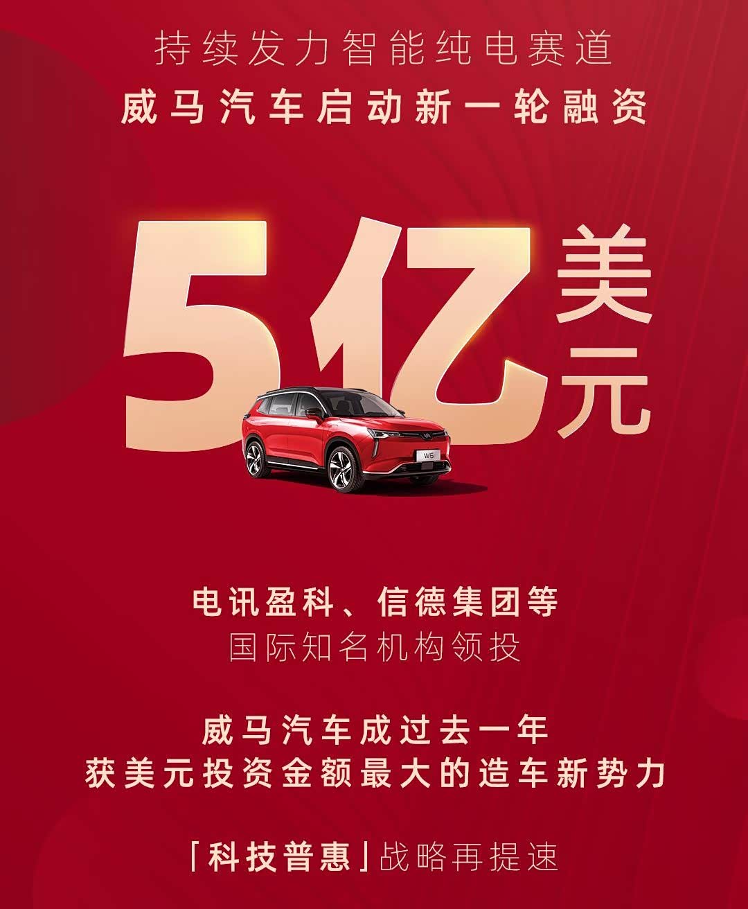 10月5日,威马宣布预计将获得5亿美元的D轮融资。其中D1轮融资由电讯盈科和信德集团领投,融资金额超过3亿美元。随后,威马汽车还会与其他几家知名投资机构签署D2轮融资协议。