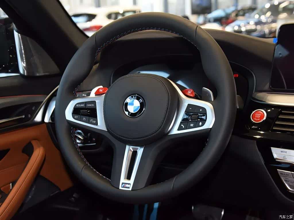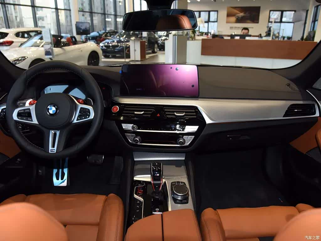 中期改款宝马M5的内饰设计语言变化并不大,中央显示屏升级为12.3英寸,同时也配备带有换挡拨片的M运动方向盘、独立的红色M1/M2按钮、别致的档把以及档把左侧加入SETUP和M Mode按钮等等,座椅皮革做工更加精细。
