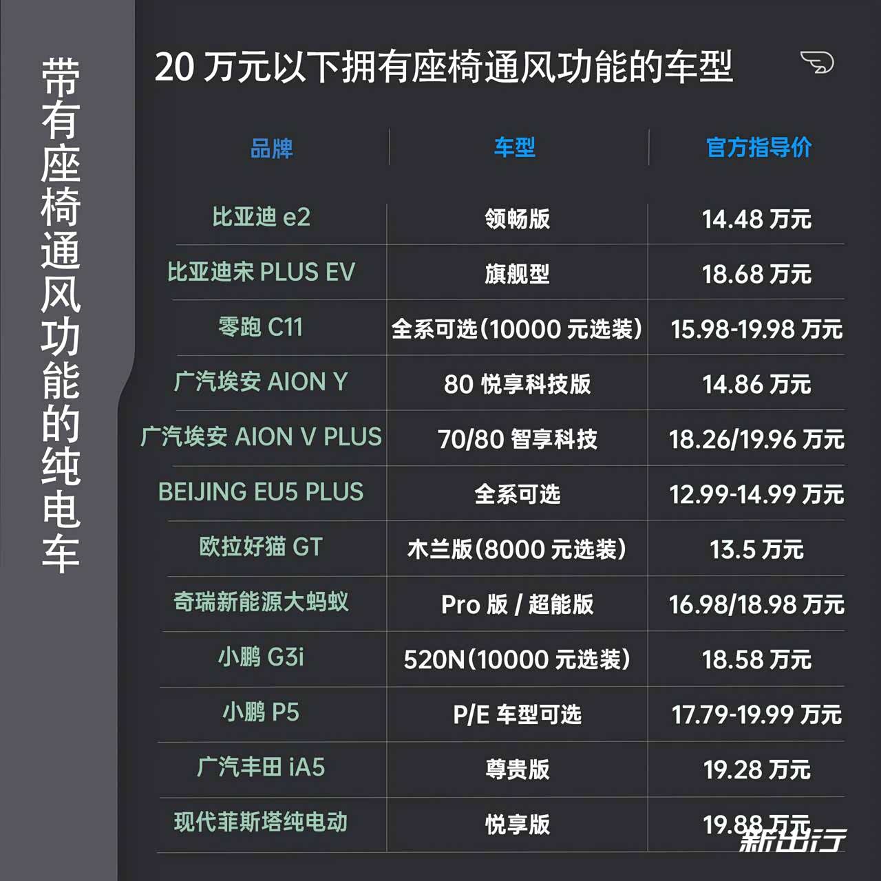 在纯电车领域中,我们以 20 万元作为分水岭,来看看在 20 万元以下有哪些车型是搭载了座椅通风功能的。