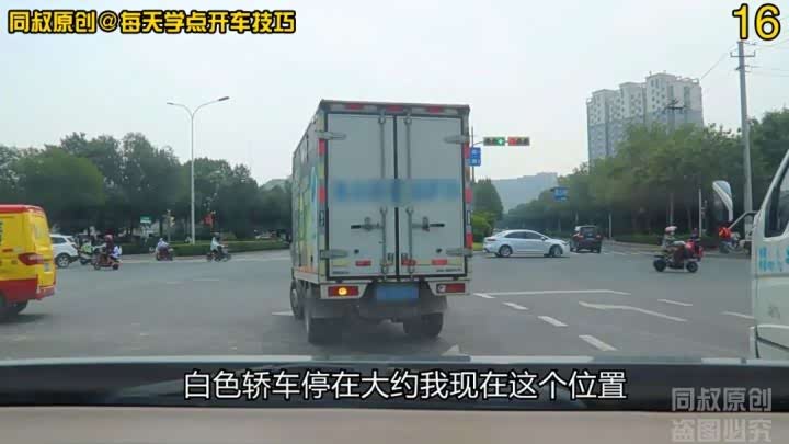我再讲一下,刚才直行绿灯左转红灯的时候,白色轿车停在大约我现在这个位置,我就判断他掉头而不是左转。