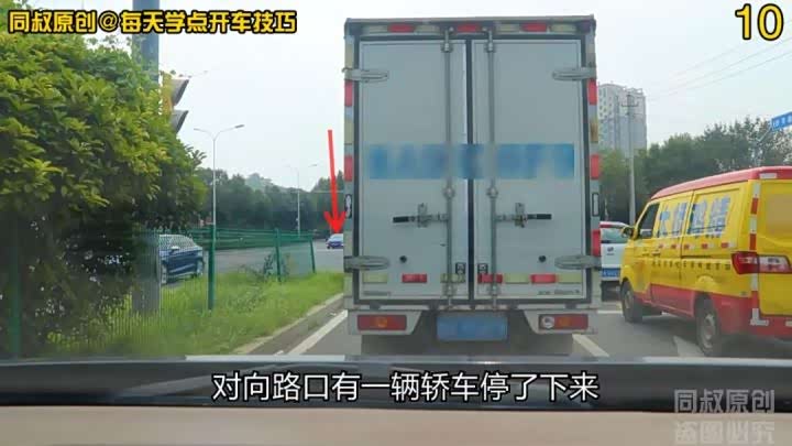 对向路口有一辆轿车停了下来,我的视线被厢卡车所遮挡,虽然看不到信号灯,但可以判断直行信号已经转换为红灯,左转信号开始转换为绿灯。