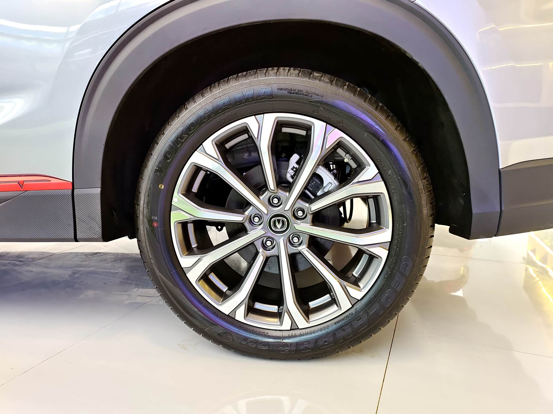 实拍车型采用的是来自优科豪马的225/55 R19规格轮胎,轮毂采用了类似密幅式的造型,很有档次感。
