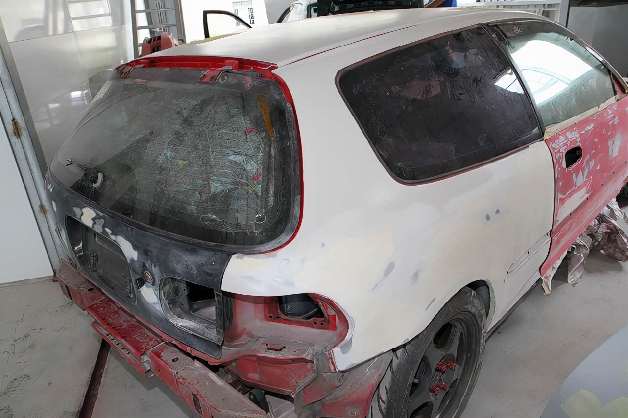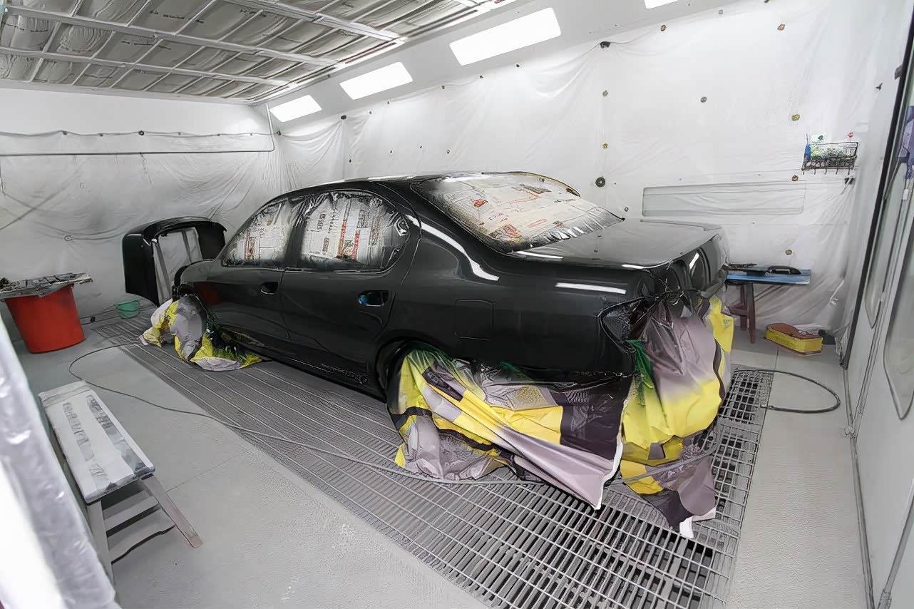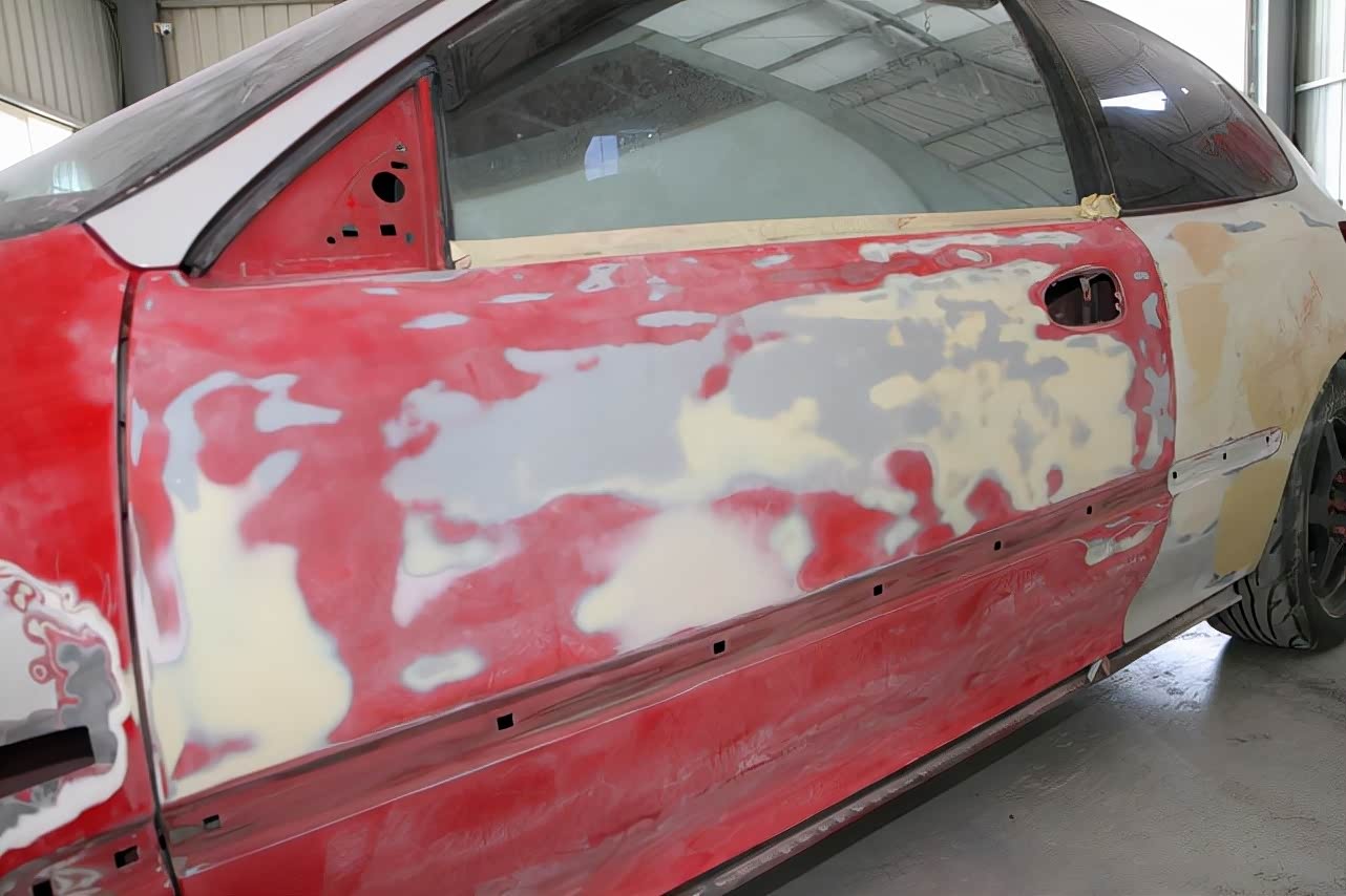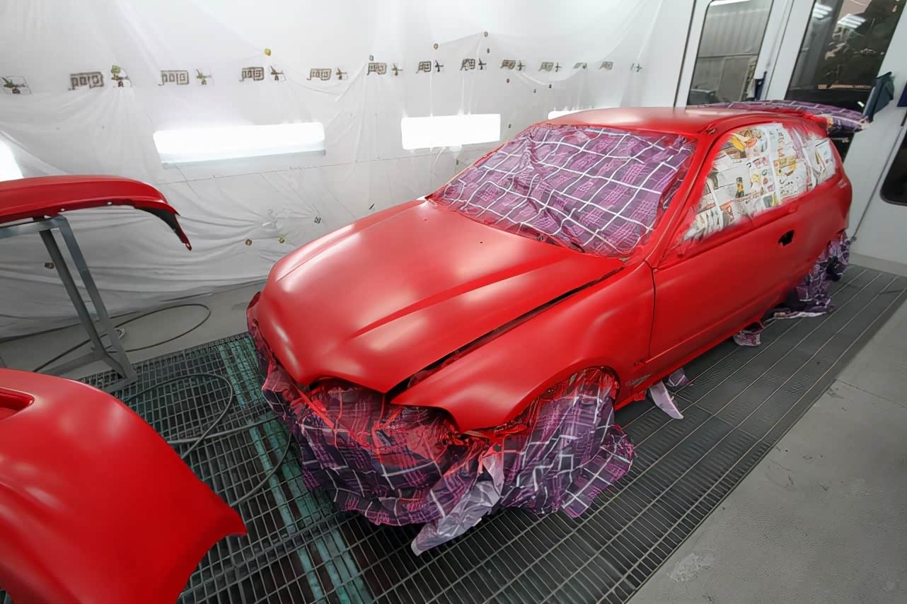 将全车的钣金表面都补土研磨整平后,就可将全车喷上底漆,目的在提高表面毛细孔增加色漆的附着力,让色漆不易垂流与飞扬,有些烤漆厂不见得会这么「搞工」,还会保留部分旧漆直接喷上新漆,效果当然有差别。