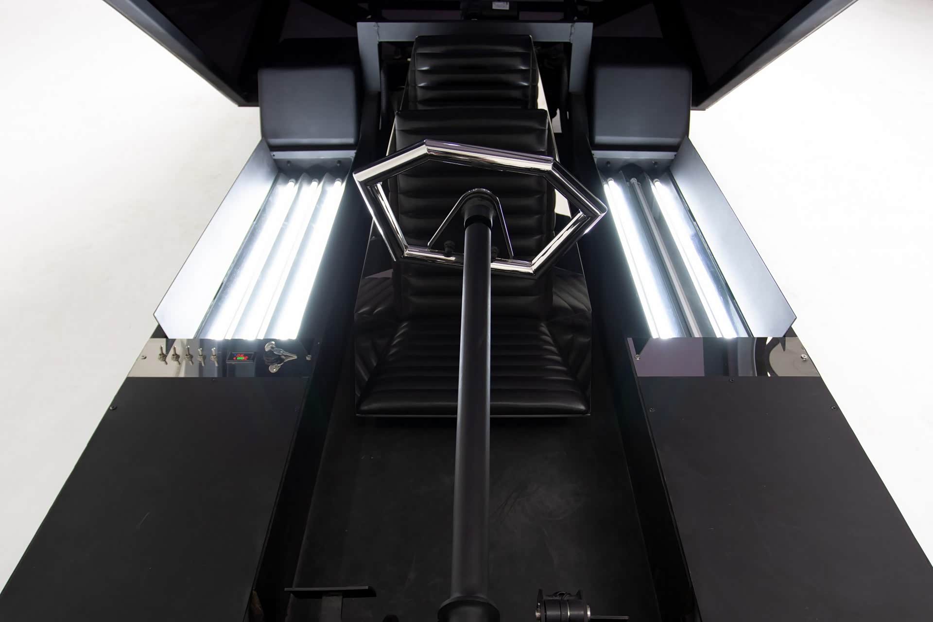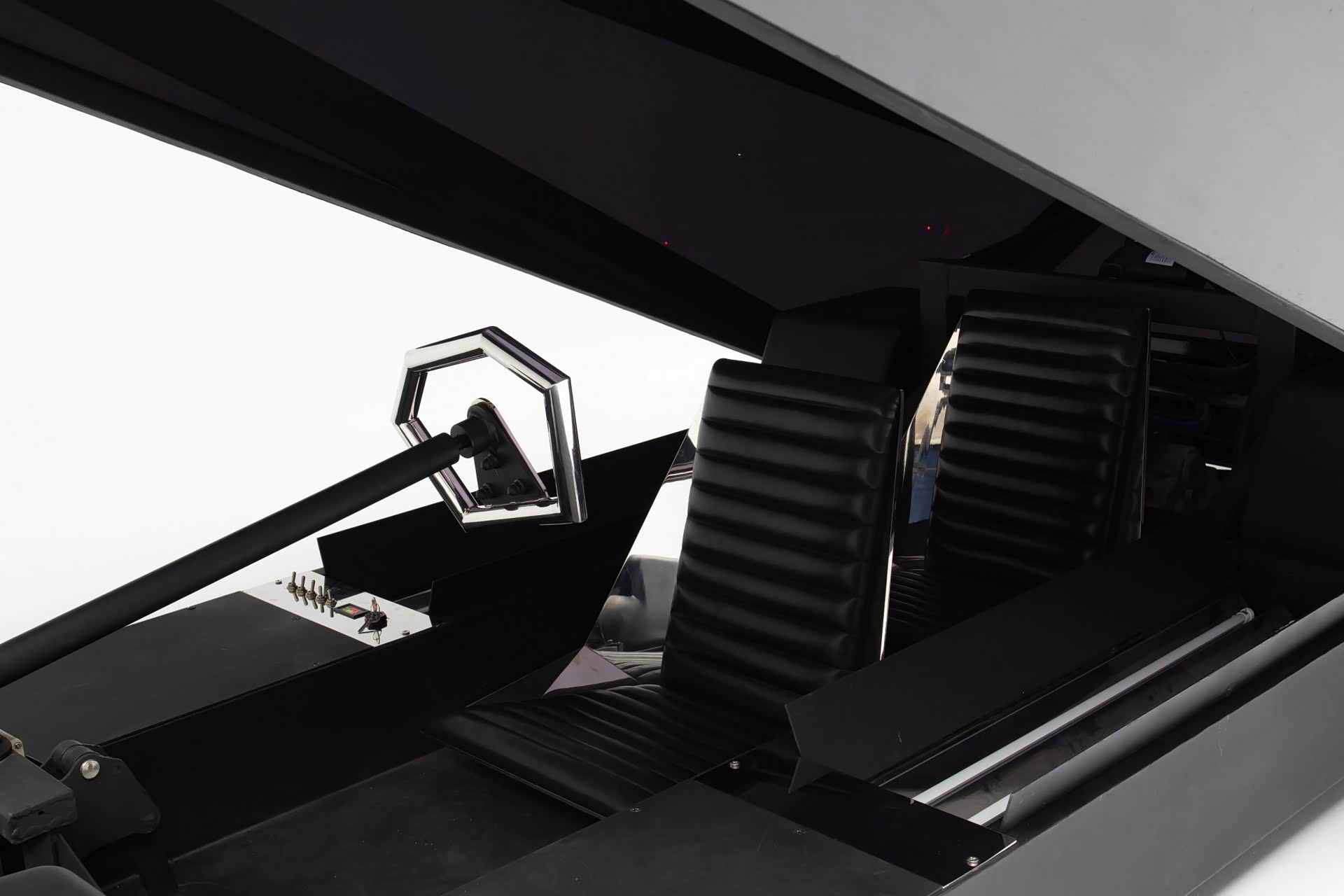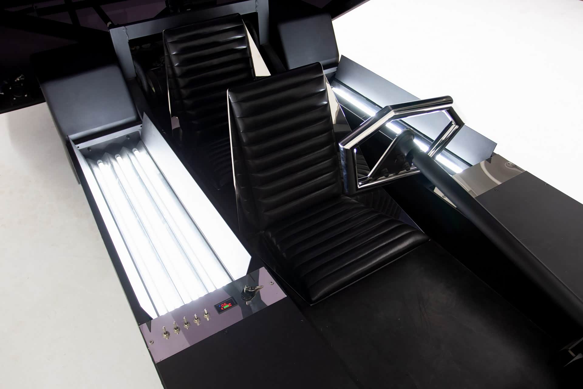 车身由透明的聚碳酸酯板制成,它包括前后的灯条。在下面可以看到汽车的钢管框架底盘,上面有两个直排座椅和一个镀铬的六角形方向盘。