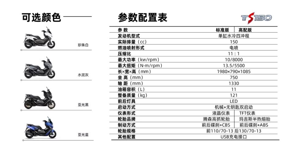 配置方面,因为标准版和高配版有点区别:标准版采用液晶仪表、腾森高抓轮胎和CBS,高配版采用TFT仪表、玛吉斯半热熔轮胎和ABS防抱死系统。除此之外,实用配置上这款车也搭配了机械+无钥匙双启动、USB接口、可调风挡等,应对日常骑行完全没有问题。
