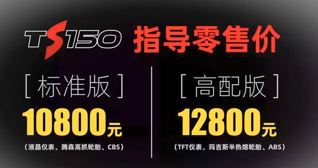 天鹰TS150上市于今年的9月份,官方一共公布了两个版本分别为CBS和ABS版,而它们的售价分别为10800元、12800元,价格表现很有亲和力。就拿目前市场上的车型来说,售价最低也要1万元左右,所以天鹰TS150在市场上还是很有竞争优势的。