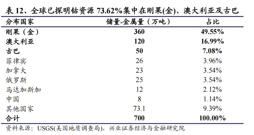 除了碳酸锂对外依赖高,中国钴资源的对外依赖度也很高。钴资源73.62%分布在刚果(金)、澳大利亚和古巴,中国钴资源十分短缺,进口依赖度在 90%以上。