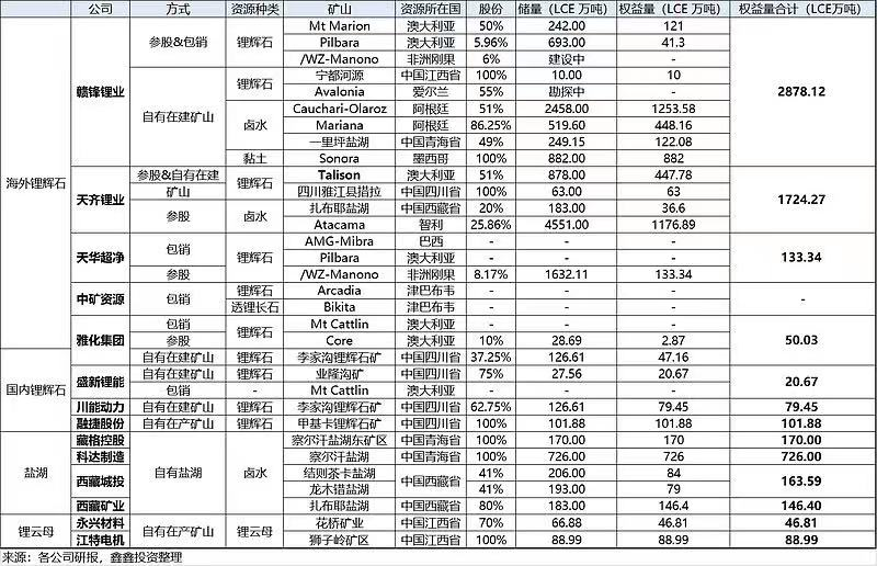 中国企业通过参股、报销、自有等方式参与海外矿山的开发,赣锋锂业和天齐锂业是开发海外锂矿较多的企业。