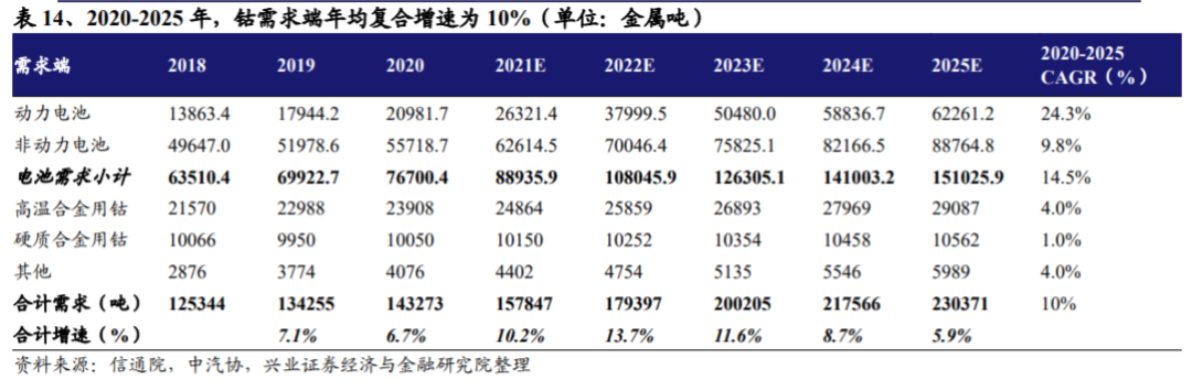 兴业证券预测, 2025年动力电池用钴达到 6.2万吨的量级,年均复合增速高达 24.3%。