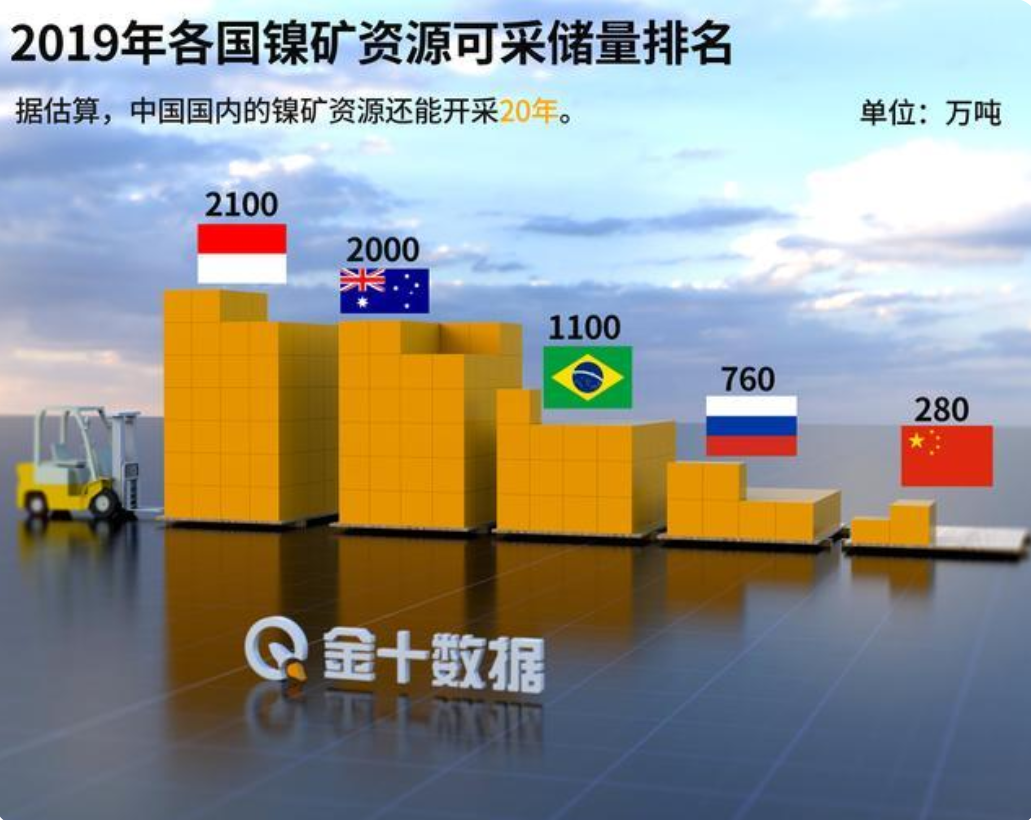 在镍矿方面,中国目前探明的镍矿资源储量仅占全球总量的3.7%,可以说镍矿资源储备严重不足。根据不完全统计,中国镍矿进口依赖程度超过80%,主要进口国印尼以及菲律宾。