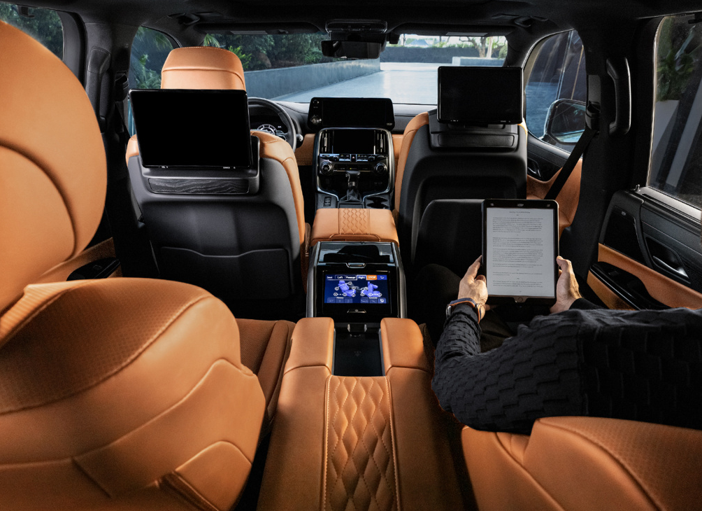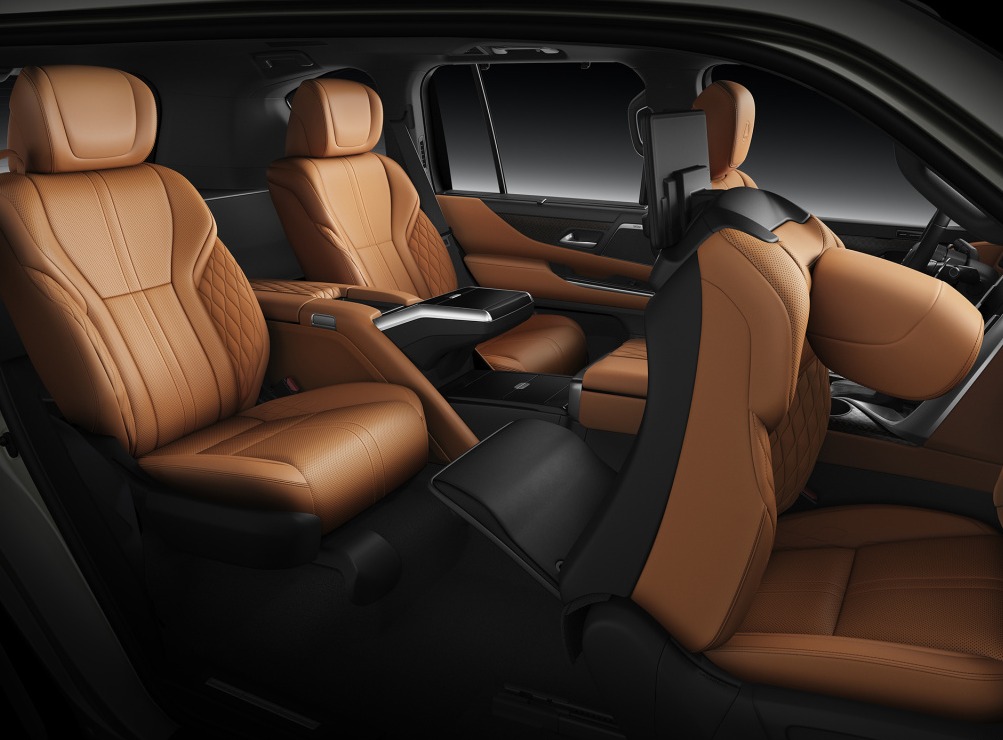 内饰设计上,LX600让我们看到了新的设计,尤其是中控台以及中控屏的区域,有着较为明显的改动,一块悬浮式中控屏,一块嵌入式大屏,大大增加了LX600车内的科技感。与此同时,雷克萨斯式的豪华氛围,在没有缺席的同时,也进行了提升,使得这台车内饰的豪华感更足了。特别值得一提的是,LX600还增加了4座布局,这仿佛在告诉那些商务人士,不喜欢LM造型的,可以选我。