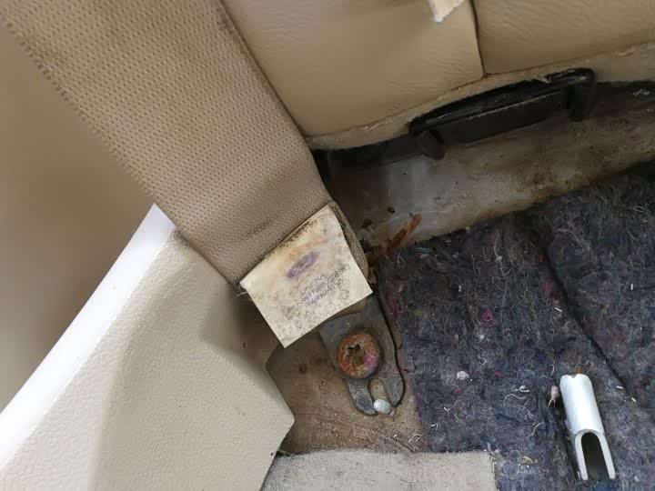 经过沟通,车主同意拆掉饰板,这不掀开后座,座椅下部的生锈一目了然,还有泥沙残留的情况!