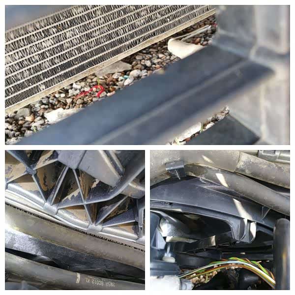 往里看到冷凝器、散热器有变形,就能理解水箱框架为什么会喷漆了!散热风扇直接换掉了,成色比旁边的其它部件新很多。