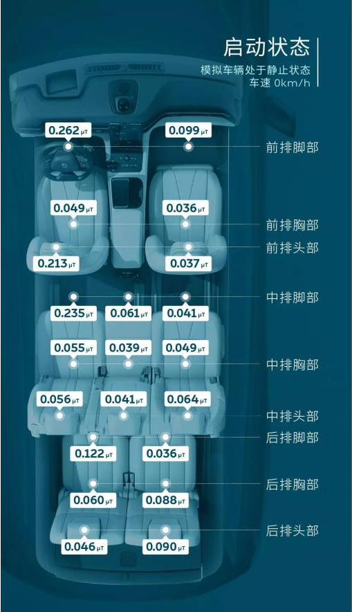 据某机构测试发现,电动车在静止和运行状态下电磁辐射测试数据不一,但辐射强度比我们想象的要低得多。直接上一张图,让大家清楚地看到一辆车不同位置的辐射强度。