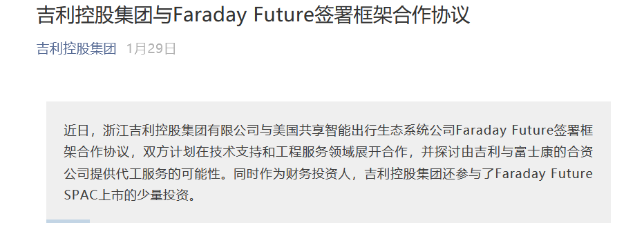 是的,你没看错。吉利与贾跃亭的Faraday Future也有合作。双方的合作开始于今年年初。今年1月29号,吉利控股集团官方推送了与Faraday Future签署框架合作协议。