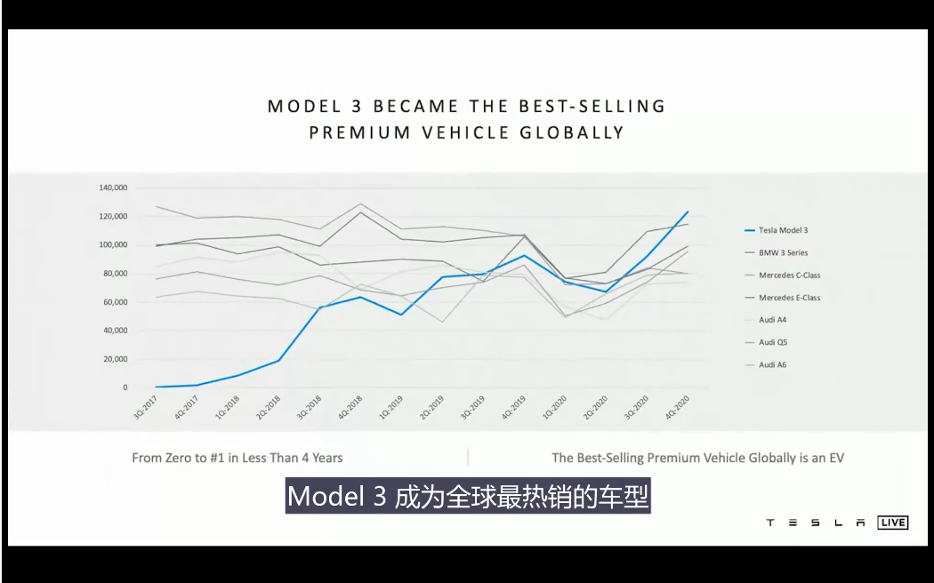 在短短四年的时间里, 特斯拉Model 3便成为全球最受欢迎的纯电动车,从最开始的0增长至如今的每季度12万辆左右。