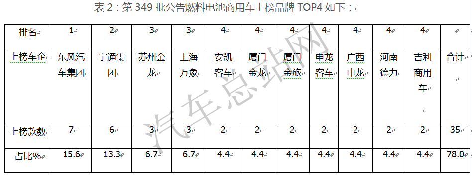 (截图3:第349批公告上榜的燃料电池商用车配套商统计)